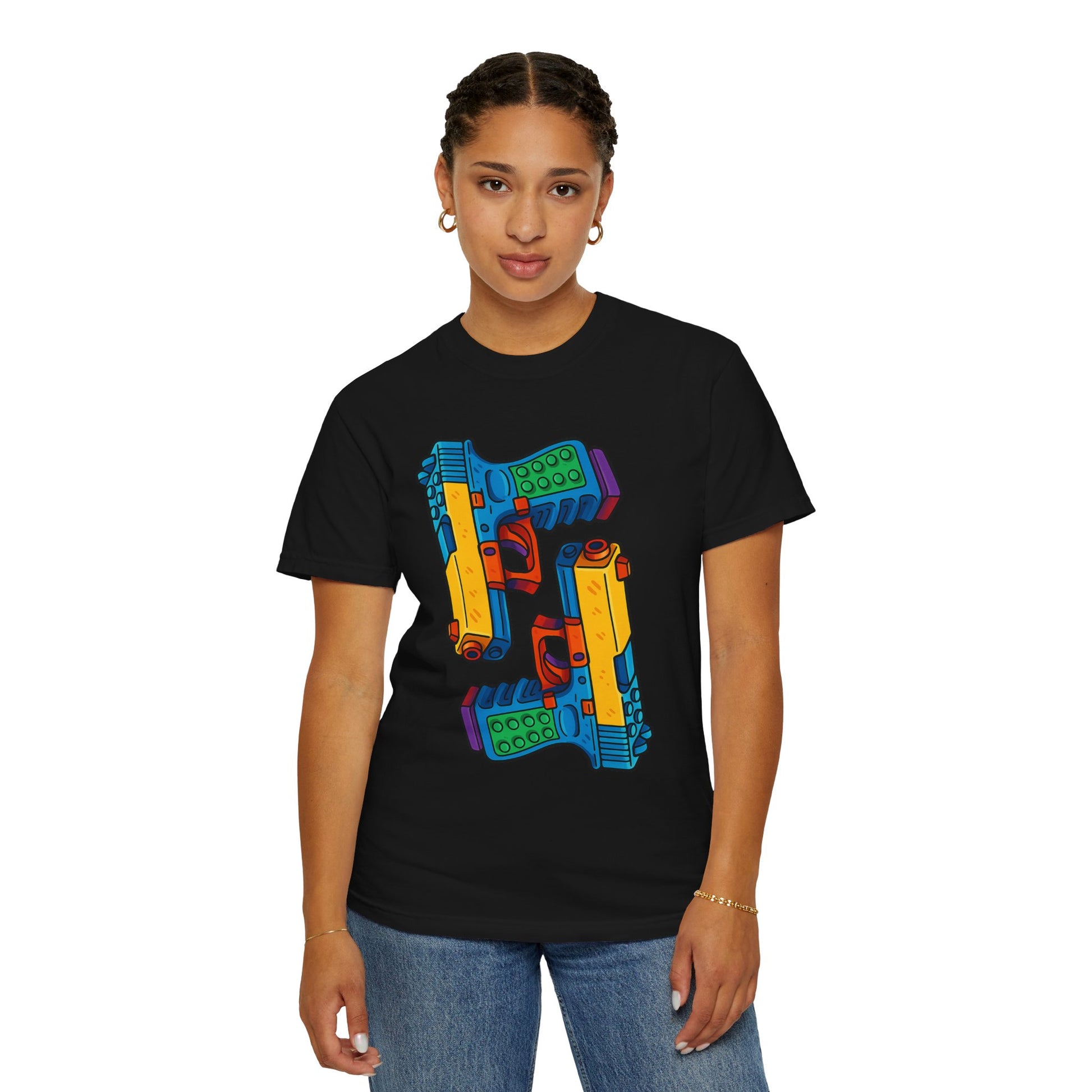 This shirt doesn’t whisper. It kicks the door down in technicolor, throwing subtlety into a dumpster fire. Two pistols, more colors than a box of stolen crayons, and enough chaotic energy to make even the calmest bystander question your life choices.
