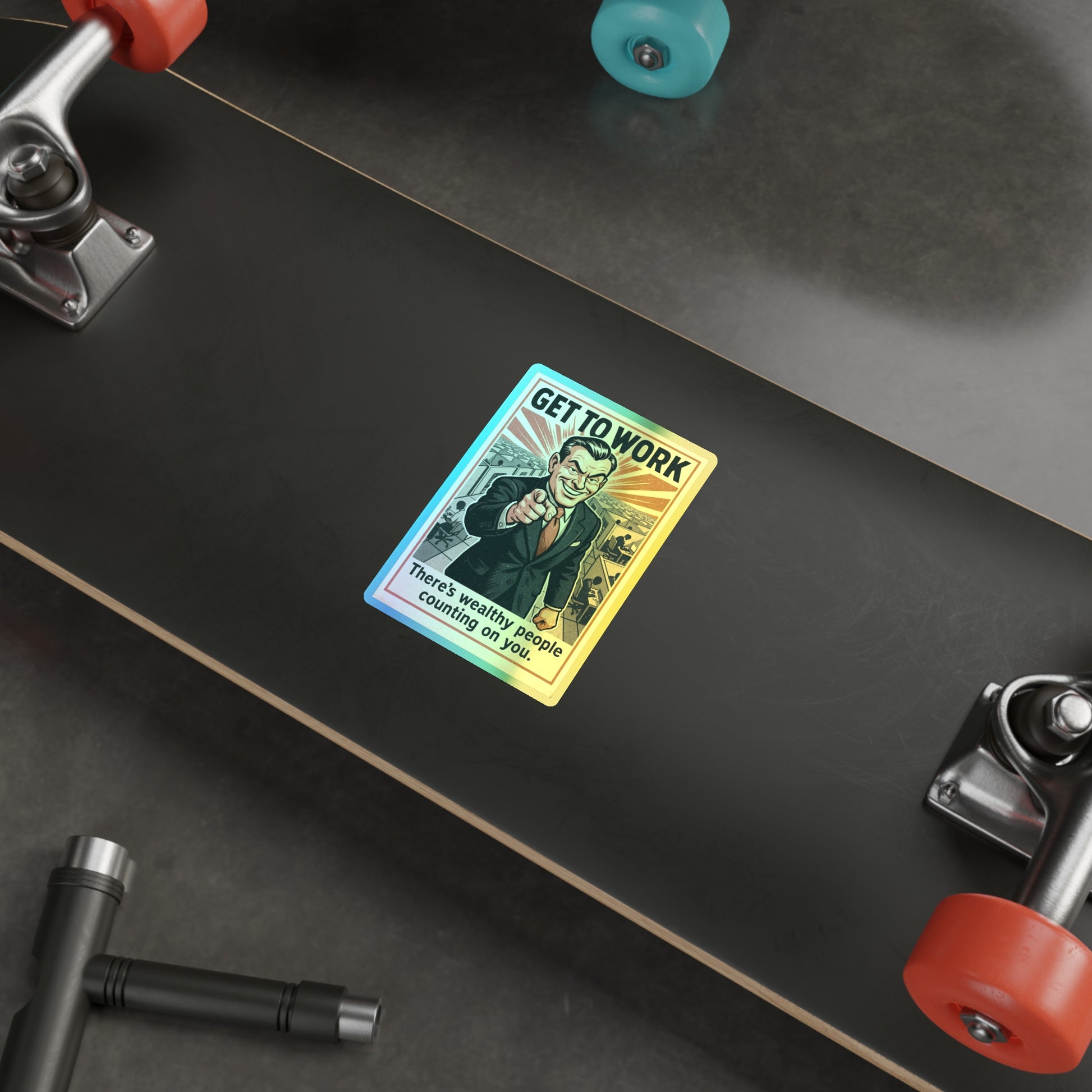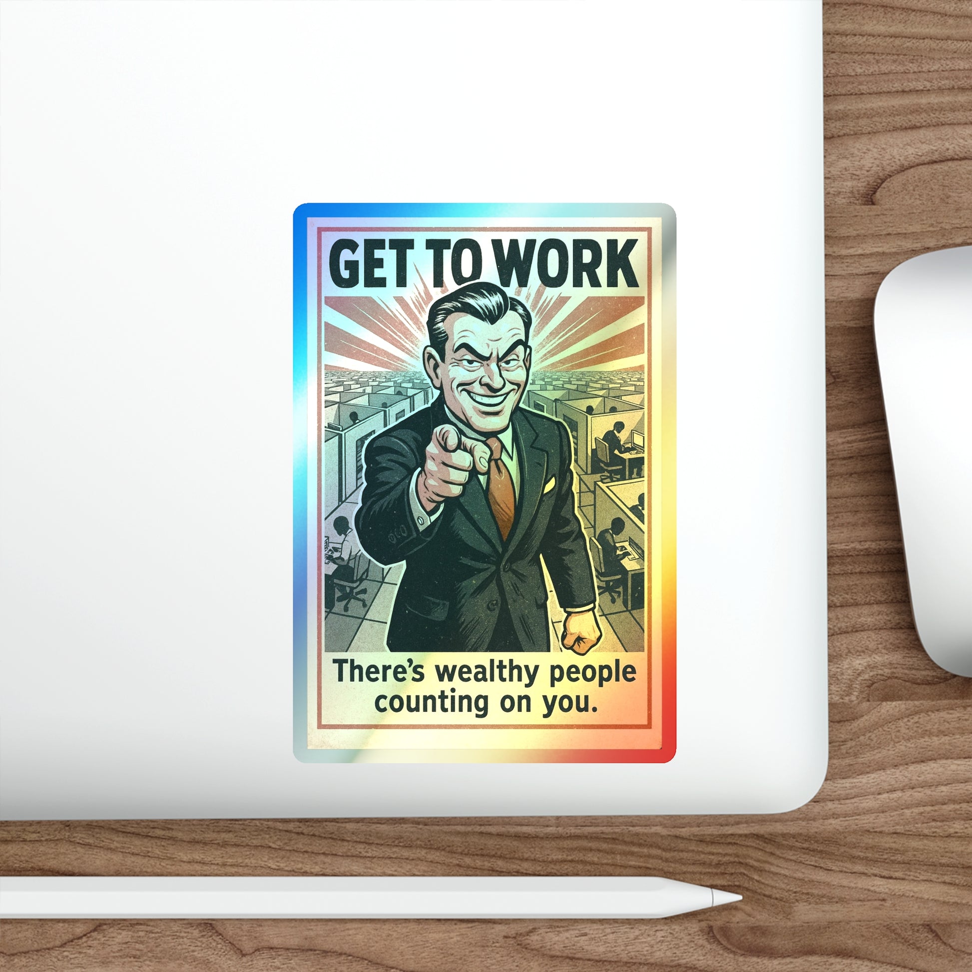 This sticker is pure corporate gaslight, wrapped in a vintage propaganda suit and dipped in holographic guilt glitter. Your new favorite piece of soul-crushing decor, ready to shine on laptops, water bottles, or break room fridges with the oppressive glow of late-stage capitalism.