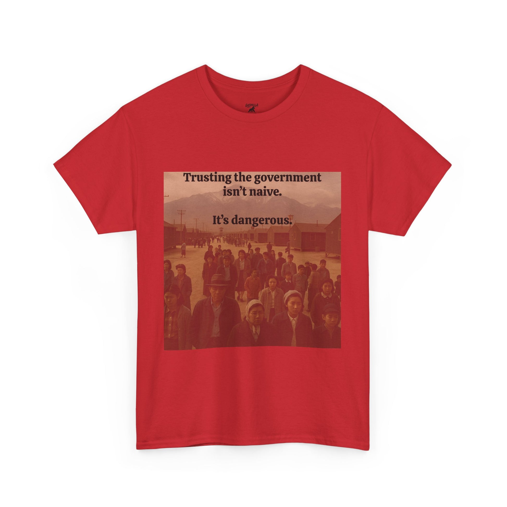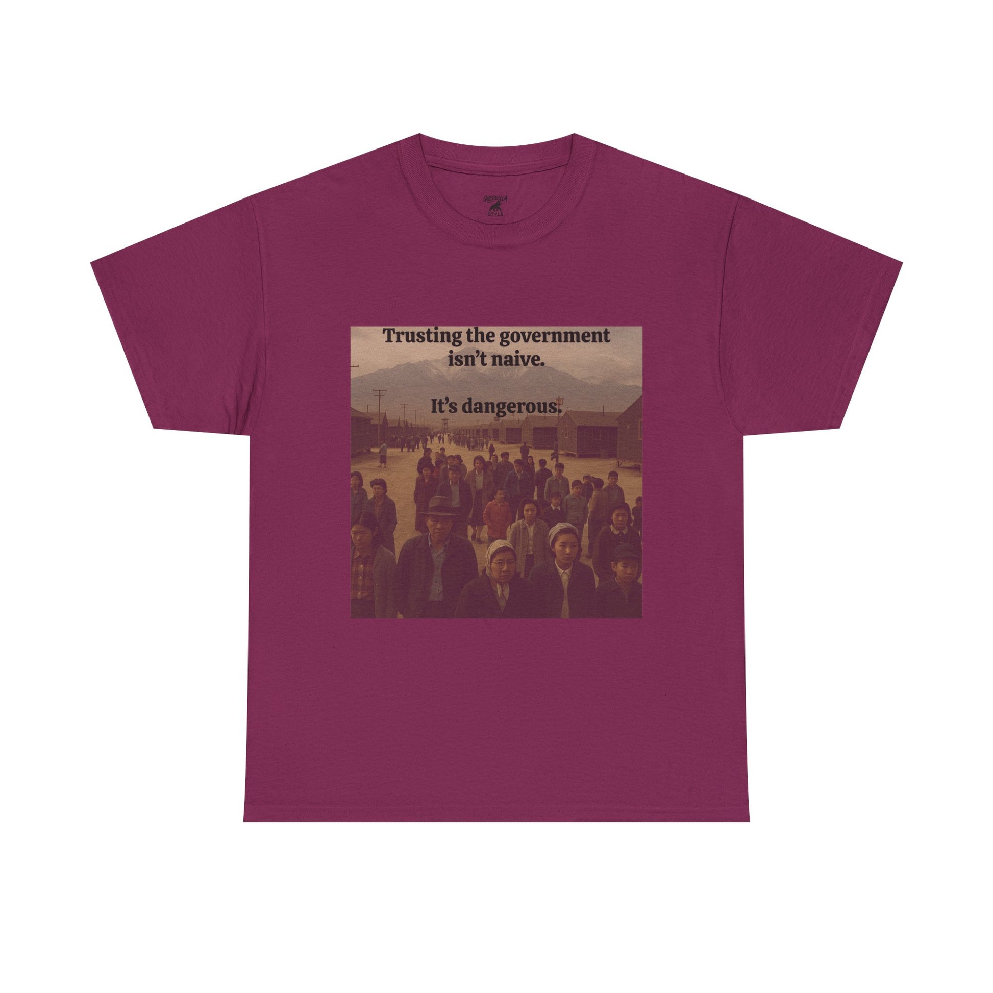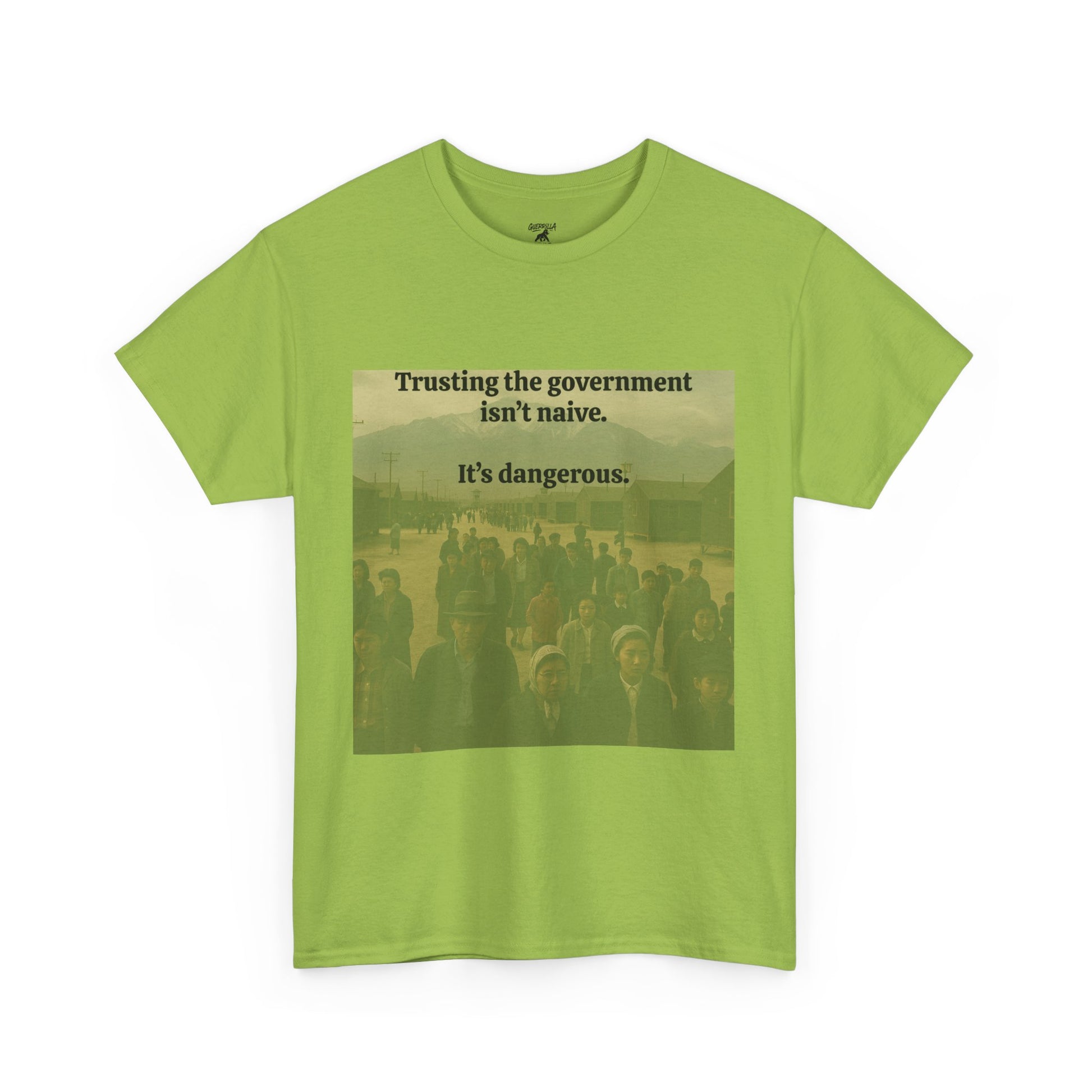 This shirt doesn’t just question authority. It calls out the blind faith that built internment camps, buried whistleblowers, and signed off on “oops” drone strikes.